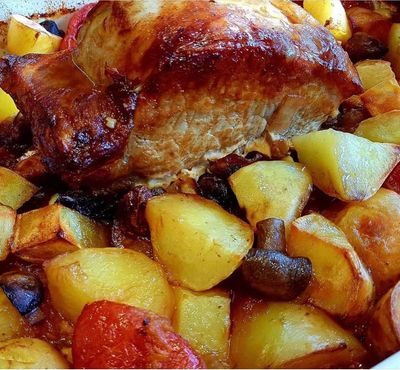 Add Potatoes, onion, garlic, tomatoes all-around the meat and shake lots of Everything Spice all around them and all over the meat and cover it with bacon.
