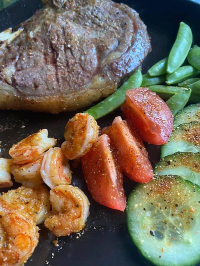 Rib eye steak your choosing seasoned generously with Everything spice on both sides, placed in preheated air fryer at 400F for 6mins flip and cook 5 more mins.