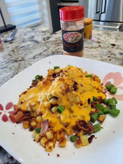 Place hash browns on a plate and top with scramble mixture, add everything spice and top with cheese sauce!
